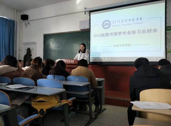 各实习小组的成员依次就本次实习活动向大家作了介绍,检视了在实习过程中发现的问题,并阐述了对图书馆事业发展和未来参加工作的思考。亢琦老师对本次实习的一些新变化做了总结,除了实习基地的拓展之外,学生还可以自主选择实习机构(由亢琦老师联系学生所在家乡的图书馆等机构或自行联系),诸如内蒙古自治区人民医院图书馆、锡林郭勒盟太仆寺旗图书馆、巴彦淖尔市乌拉特前旗人民武装部等机构的实习活动。实习机构的增加宣传了图书馆学专业,扩大了专业影响力,更重要的是使得同学们在此次实习活动开拓了视野,了解了不同机构的信息管理工作,积累到了更多的经验,收获了更多的知识,增强了学生对本专业的荣誉感与责任感。