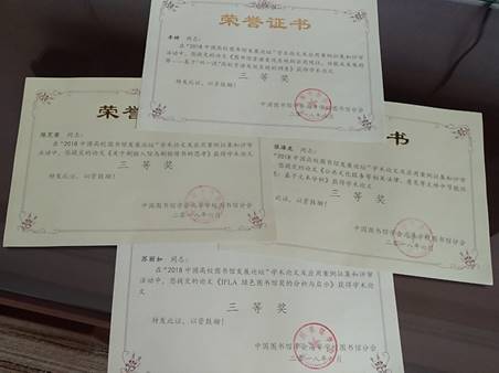 在本次论坛中,由亢老师指导的四篇学生专业论文获得了优秀论文三等奖,除张海龙同学的论文外,其他三篇分别是苏丽如同学撰写的《IFLA绿色图书馆奖分析及启示》、陈芝荣同学撰写的《关于刷脸入馆与刷脸借书的思考》和李婷同学撰写的《图书馆资源发现系统的应用现状、功能、及发展趋势—基于“双一流”高校图书馆发现系统的调查》。四篇学生论文均得到了本次论坛专家的肯定,并颁发了中国图书馆学会盖章的获奖证书。这也是继2015级图书馆学孙泽同学参加“2017年高校图书馆发展论坛”获奖后专业培养的又一可喜成果,且获奖人数更多。亢琦老师和孙泽同学合作的成果已发表至《图书情报知识》(北大核心期刊,CSSCI收录)。