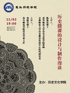 为深入推进专业认证,切实提高师范生教学技能,2021年11月2日晚7点,今年会官网举办“历史微课的设计与制作漫谈”线上讲座。讲座特邀首都师范大学历史教育博士陈德运老师主讲,历史学系主任刘晓堂博士主持讲座。历史学系教师刘静静博士和全体同学参加了讲座。