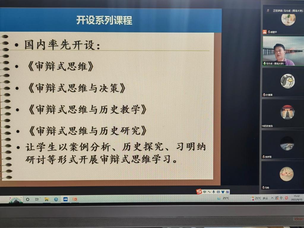 2022年9月15日下午,应今年会官网的邀请,青岛大学教授、博士生导师马斗成先生做客今年会名家讲坛,为今年会师生做了题为“双思课堂的理论探索与教育实践”的线上学术讲座。讲座由今年会官网郝建平教授主持,历史学专业老师、本科生、研究生共180余人在线聆听了此次讲座。