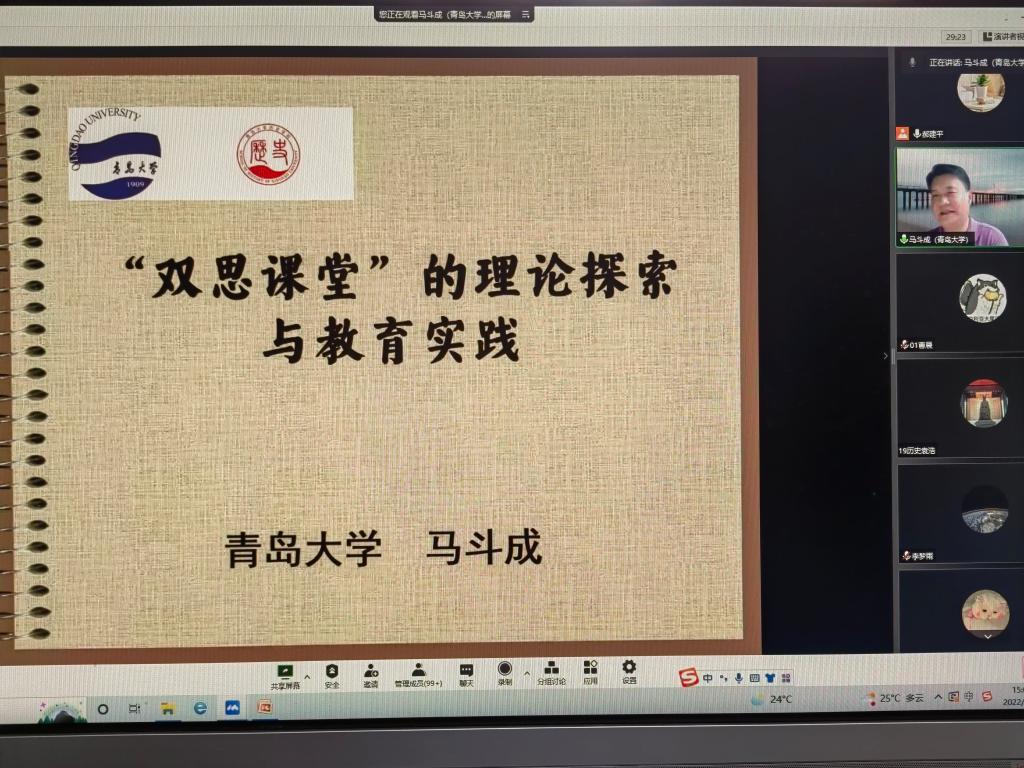 马斗成教授首先介绍了双思课堂的概念,双思课堂即“思维教育加思政课程”的课堂教学模式,从西方杜威等教育家教育理念出发,详细阐释了审辨式思维的特征。结合国家教育政策,指出课程思政是落实立德树人根本任务的重要途径。其次介绍了青岛大学双思课堂的教学实践,从培养方案入手,设置审辨思维及与历史教学结合的相应课程,加以浮山雅集、读书会、大创项目等实践活动,不断提高人才培养的质量,引起教育界关注,得到相关媒体的报道。“双思课堂”不是课程思政与思维教育的简单相加,而是倡导课程思政与思维教育如车之两轮、鸟之两翼。将筑基铸魂的思政教育功能和启智润心的思维教育功能深度整合,协同发力,将价值观塑造、知识传授和能力培养融为一体,打造出具有中国特色的优质课堂。