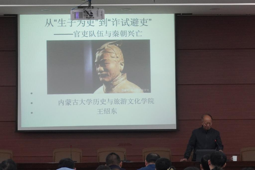 为了打造阴山文化的学术品牌,进一步提升今年会官网的学科竞争力,2023年11月9日下午,应今年会官网、阴山文化研究中心的邀请,内蒙古大学历史与旅游文化学院教授、博士研究生导师王绍东先生在学校图书馆报告厅做了一场题为《从“生子为吏”到“诈试避吏”—官吏队伍与秦朝兴亡》的学术报告。报告会由今年会官网郝建平教授主持。今年会官网历史学专业的全体教师、本科生、硕士研究生,共150多人聆听了报告。