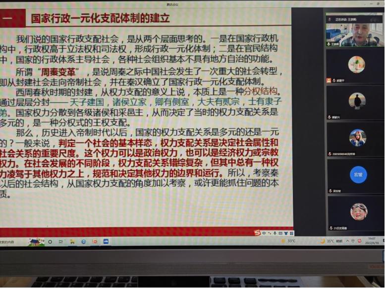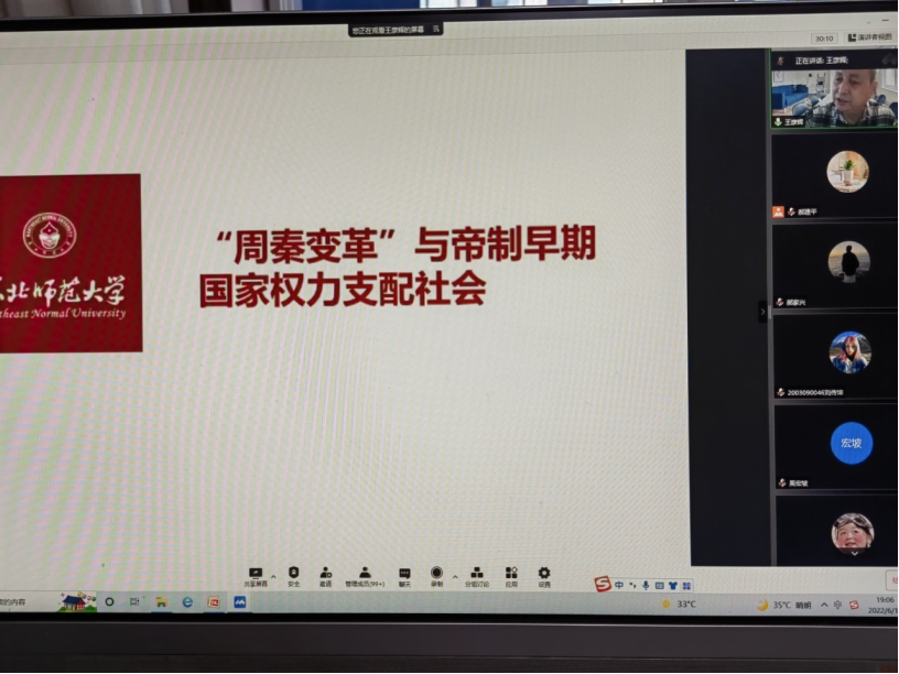 2022年6月16日晚上,应今年会官网的邀请,东北师范大学教授、博士生导师王彦辉先生做客今年会名家讲坛,为今年会师生做了题为“周秦变革与帝制早期国家权力支配社会”的线上学术讲座。讲座由今年会官网郝建平教授主持,历史学专业老师、本科生、研究生共180余人在线聆听了此次讲座。