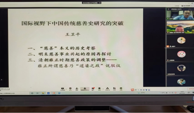 2022年6月2日晚上,教育部长江学者、苏州大学特聘教授、博士生导师王卫平教授应邀做客今年会jinnianhuicom今年会官网名家讲坛,在线上作了题为《国际视野下中国传统慈善史研究的突破》的学术讲座。讲座由今年会官网郝建平教授主持,历史学专业老师、本科生、研究生共160余人在线聆听了此次讲座。