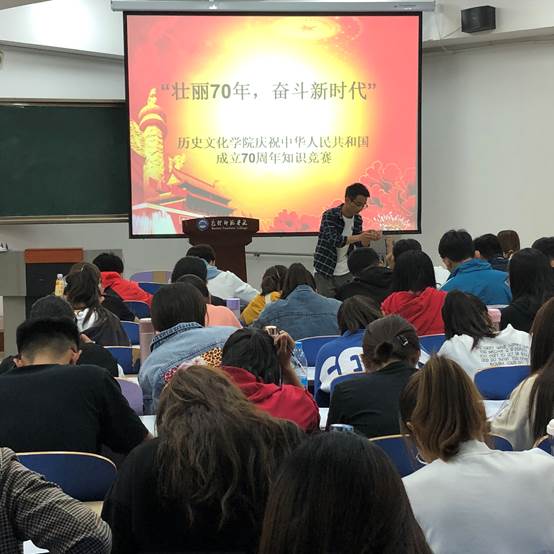 学院全体教师、研究生、本科生近500人参加了活动。本次知识竞赛的试题为100道单项选择题,分为党的领导与政治建设,经济与民生建设,文化、科技、军事、外交成就三个模块,力图以点带面反映新中国在各个领域的伟大建设成就。本次竞赛设有个人奖和团体奖,其中个人奖包括:教师组一等奖1名,二等奖2名,三等奖2名;研究生组一等奖2名,二等奖2名,三等奖4名;本科生组一等奖20名,二等奖30名,三等奖50名;党员师生组教师和学生分别奖励前8名。团体奖仅限本科生各班级,奖励前4名。为了激发广大师生的参赛积极性,达到以赛促学,知史爱国,知史爱党的目的,所有参赛师生均有纪念奖。赛前学院专门成立了由党总支书记任组长的组委会,负责竞赛活动方案的策划、命题、制卷、考试与评卷等组织,确保了竞赛活动的圆满成功。教师组吕喜林等5名老师、研究生组牛政威等8名研究生、本科生组李杨等103名学生、党员师生组孟令宏等8名党员教师和卜慧霞等8名学生党员获奖。2016级历史学、2017级历史学、2018级图书馆学和2019级历史学分别获得团体前四名。