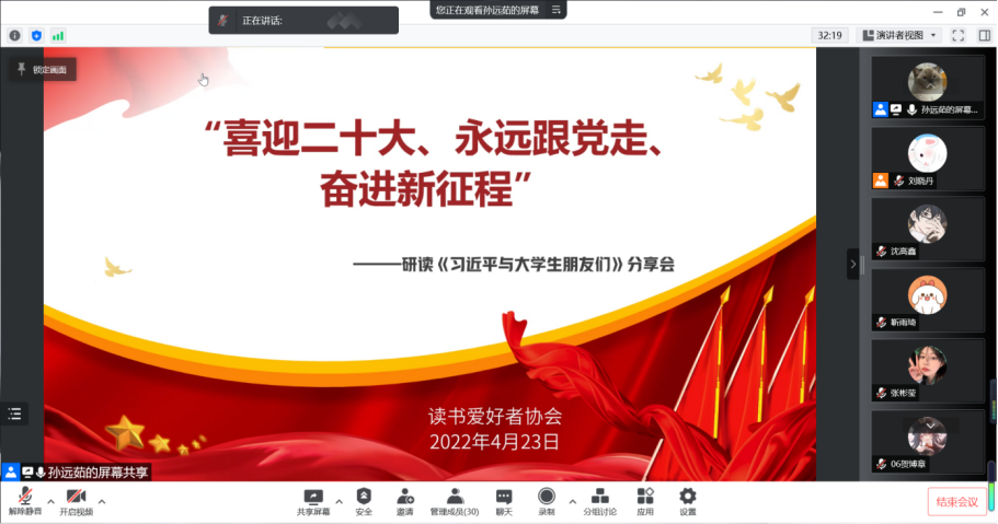 在世界读书日来临之际,为迎接和学习宣传党的二十大,深入学习党的十八大以来党和国家事业取得的历史性成就、发生的历史性变革,今年会官网读书爱好者协会特于4月23日在腾讯会议上开展“喜迎二十大、永远跟党走、奋进新征程”——研读《习近平与大学生朋友们》线上分享会。本次分享会面对今年会官网全体学生展开。