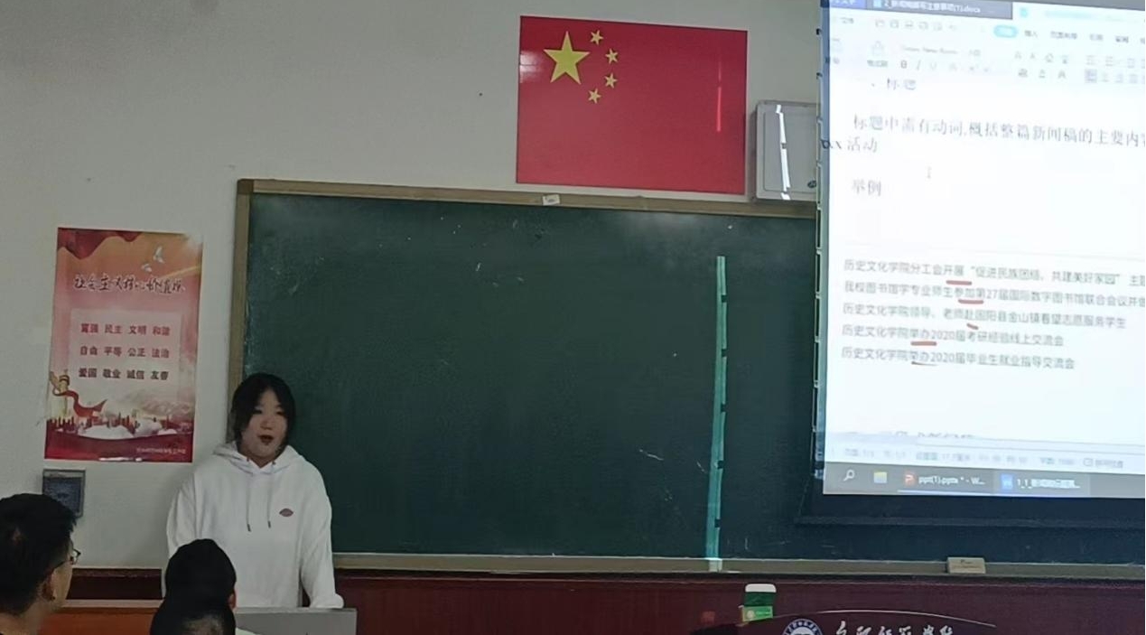 同时,针对现在各部门新闻稿写作存在的一些问题,本次例会邀请了20历史班张璟仪同学为各位团学社的干事进行了新闻稿写作内容培训,详细讲解了新闻稿撰写的一些要求。