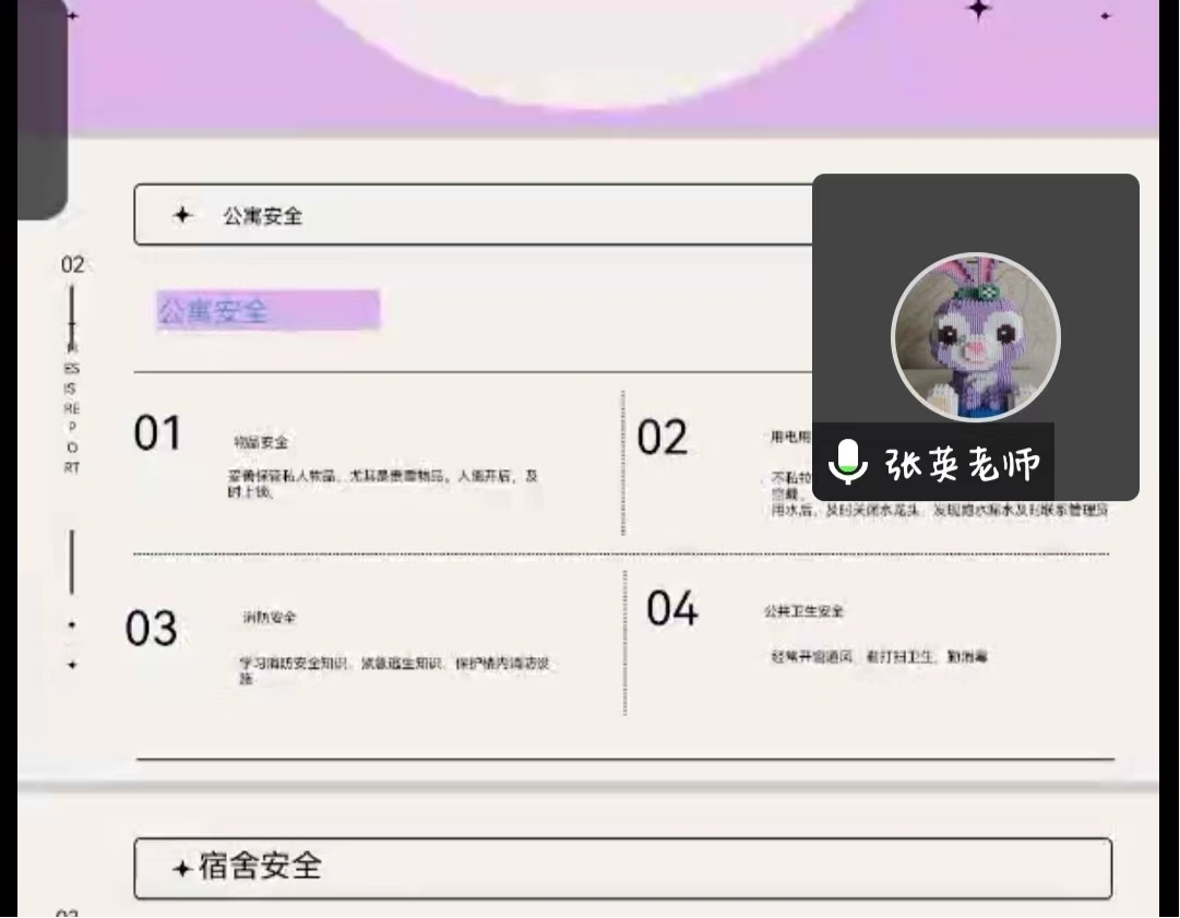为贯彻落实今年会开学第一课文件通知精神,让同学们更快的适应校园生活,以饱满的精神状态迎接新的学期。2023年3月6日晚7点,我院辅导员张英老师以腾讯会议为平台面向全院学生开展了2023年春季学期“开学第一课”主题会议,第一课以“校园安全”为主题从四个方面进行了讲解。