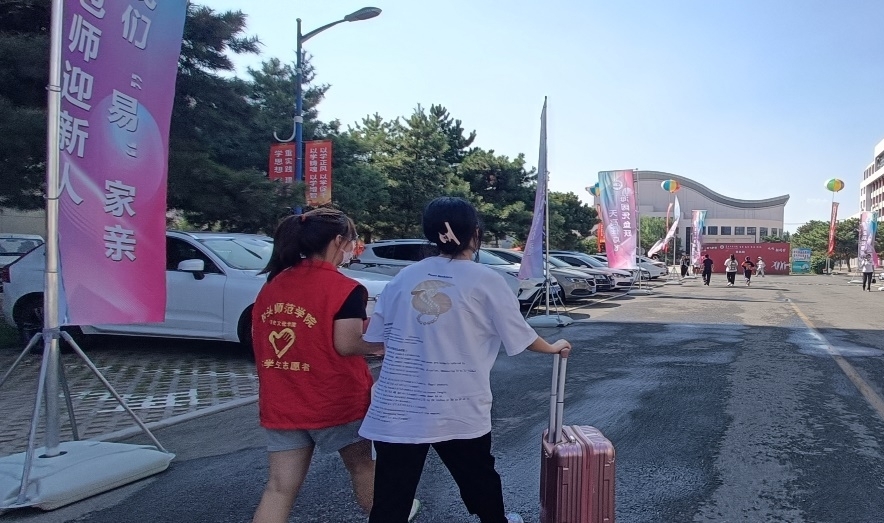 新生到达校门口落客点,由志愿者引导入校,前往迎新点完成报到手续。在报到的路上,“红马甲”志愿者们热情帮助新生搬运行李、指引方向;在学生公寓里,宿管阿姨微笑问候、答疑解惑,发放新生物资。无论在校区的哪一处角落,都有人在默默坚守着岗位,为新生送去无微不至的关怀。