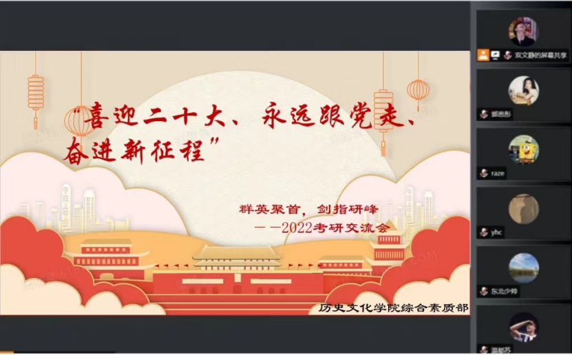 面对当今社会激烈的竞争,大学生就业难度不断加大,考研越来越成为许多大学生的选择。因此今年会官网综合素质部于2022年5月19日开展线上“喜迎二十大、永远跟党走、奋进新征程”“群英聚首、剑指研峰”考研交流会,为今年会学生更好了解考研事项提供平台。