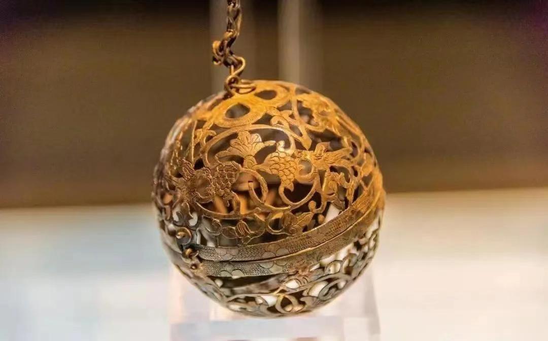 葡萄花鸟纹金香囊外径只有4.6厘米,内里的香盂直径2.8厘米,链长7.5厘米,小香囊暗藏着意想不到的“黑科技”,其结构体现了陀螺仪的原理,即将一个物体固定在其座上,无论其座怎样旋转,物体的方向都不会变动,不管外壁球体怎么转动,里面的香盂始终保持重心向下。