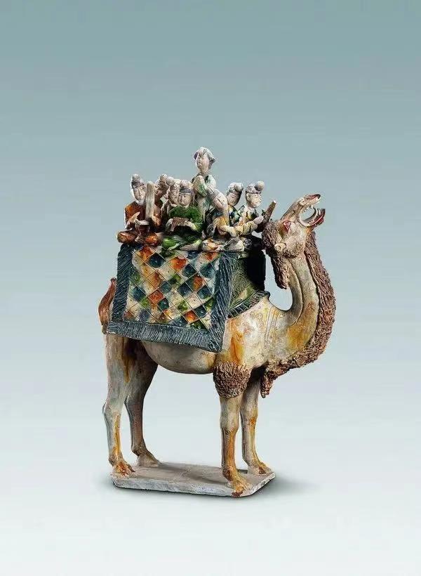 唐三彩载乐骆驼俑,国家一级文物,骆驼俑高48.5厘米,乐俑高11.5厘米。骆驼直立于长方形底板上,昂首张口,舌尖上卷,两耳竖起,坐仰天嘶鸣状。骆驼背上有七个手持各种乐器的乐偏,相背盘腿而坐。