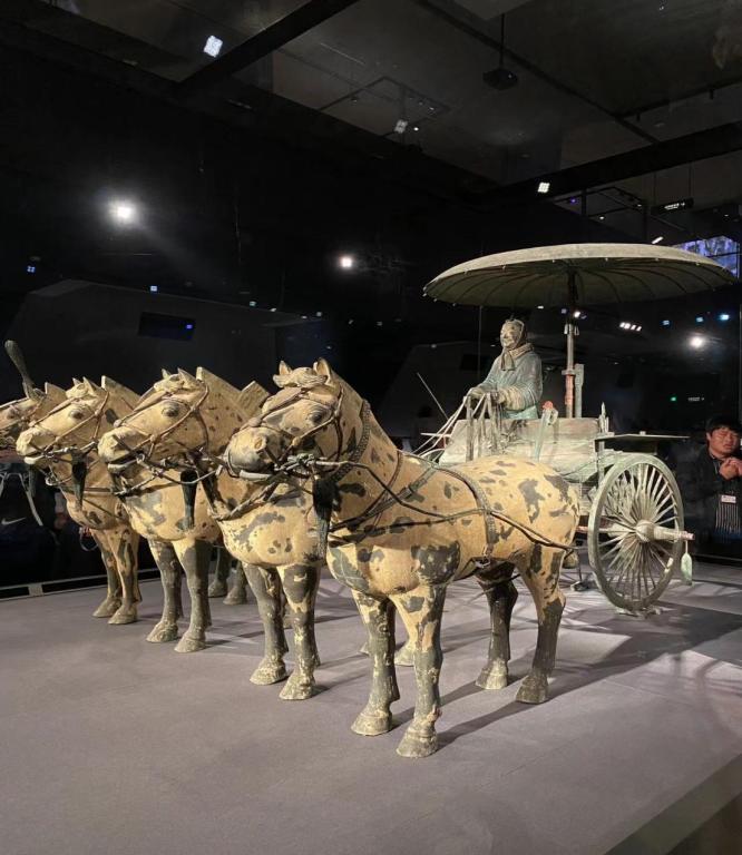 秦始皇帝陵9901陪葬坑参观完之后,到达了第二个展馆—秦陵彩绘铜车马。秦铜车马一组两乘,因年代久远,两乘车出土时破碎成3000多片,经过近8年精心修复,1989年陈列展出。两乘铜车马一为“立车”,一为“安车”,均为古代单辕双轮车,并按秦代真人车马1/2比例制作。铜车马整体用青铜铸造,使用金银饰件重量超14千克,由3500余个零部件用铸造、镶嵌、焊接、子母扣连接、活铰连接等多种工艺组装而成。