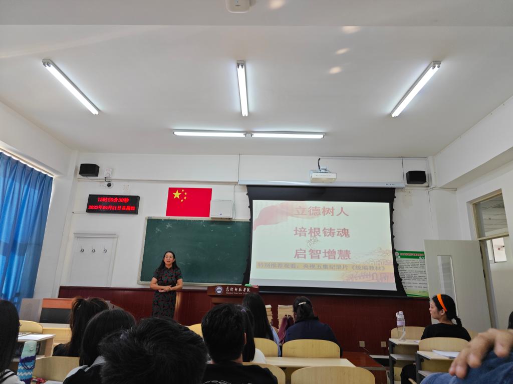 本次会议包含岗前培训和实习动员两个主题。首先,会议邀请包头市昆区教育教学研究中心历史教研员张莉莉老师进行了主题为《践行课程标准 用好统编教材》的实习岗前培训,张老师从课程标准、历史学科核心素养、统编教材和初识历史概念四个方面展开,讲座深入浅出,形象生动,理论结合实践,对启发同学们如何讲好一节课,如何成为一名好老师起到重要作用。