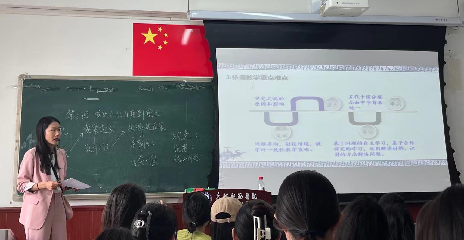 精彩的示范课结束后,李秋实老师进行了生动的说课。该环节的主要内容分为五部分——教学创意说明、学习目标的确定、落实目标的学习活动设计、作业设计和教学反思。李秋实老师为2021级历史班的同学们详细讲解了以上内容,其中再次强调了在教学实践中要依据义务教育历史课程标准进行教学,要采取教学评一致性策略,要进行大单元教学,改变传统课堂中的碎片化的学、碎片化的教、碎片化的考以及机械重复的训练,通过(大)单元教学实现各类学习素材的整合,各类情景化的问题及多样化的学习活动与任务的整合,让学生深度学习,高度参与,最终达到课堂的高效高质量,学生的核心素养提升与全面发展。
