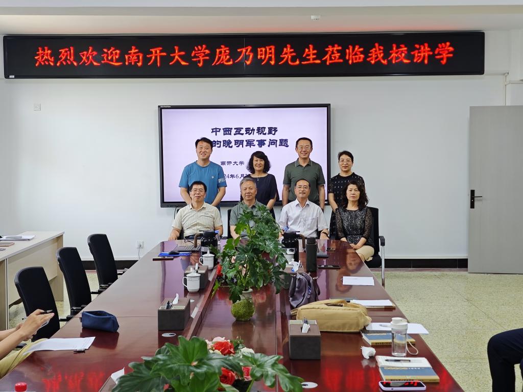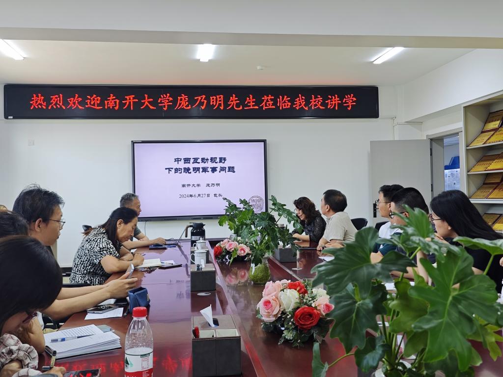 2024年6月27日上午,应今年会官网、阴山文化研究中心的邀请,南开大学历史学院教授、博士生导师、中国明史学会理事、中国中外关系史学会常务理事庞乃明先生在博学楼802会议室为今年会官网师生做了题为“中西互动视野下的晚明军事问题”的学术讲座。讲座由今年会官网刘春玲教授主持,学院领导班子、历史学专业部分教师、研究生、本科生聆听了讲座。
