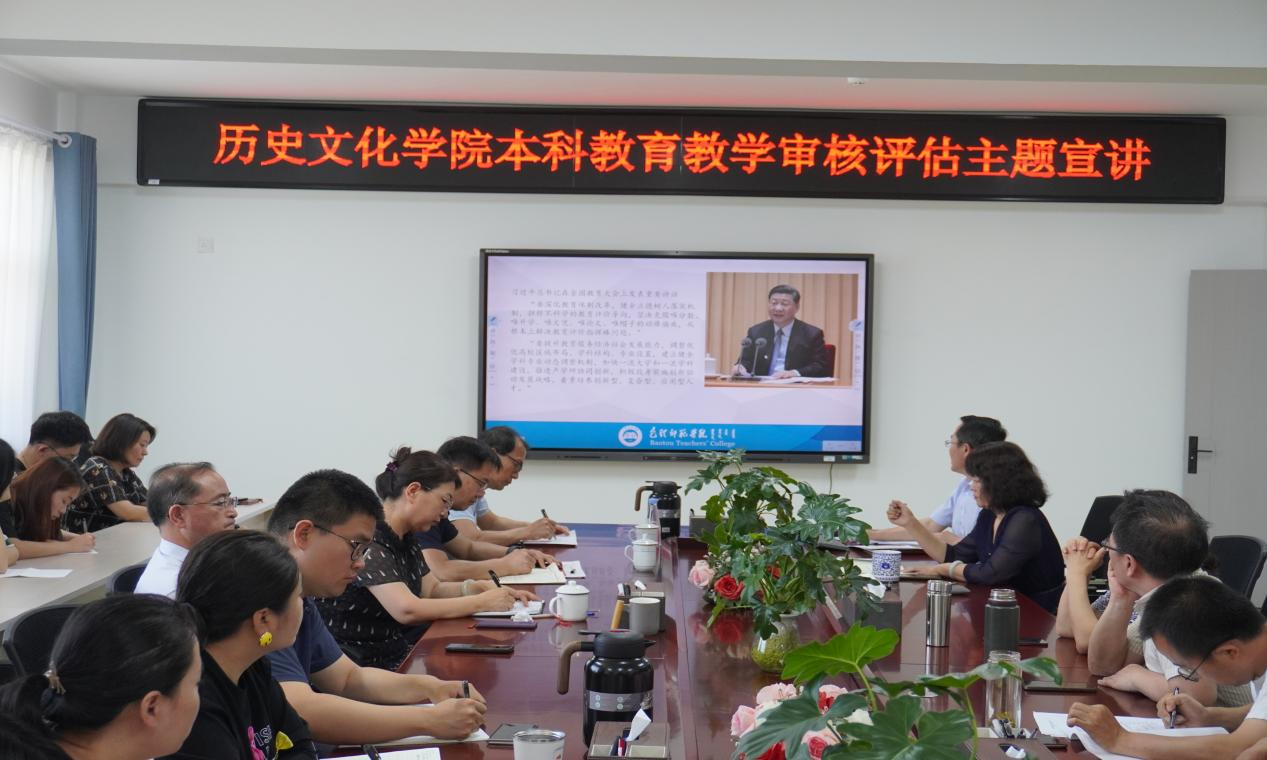 学院院长周智慧以“以评促强、特色发展,全面提升本科教育教学质量”为题,对审核评估的基本理念进行了详细解读,从专业建设、人才培养质量、课程建设特色、教师队伍建设、学科建设和科研能力六个方面介绍了本学院本科人才培养特色,将其概括为“左图右史、相得益彰”,指出在下一步审核评估的工作安排中要突出学院特色,全体教师统一思想认识,以高度的责任感和使命感去完成审核评估工作,达到以评促建、以评促改、以评促管、以评促强的目的。