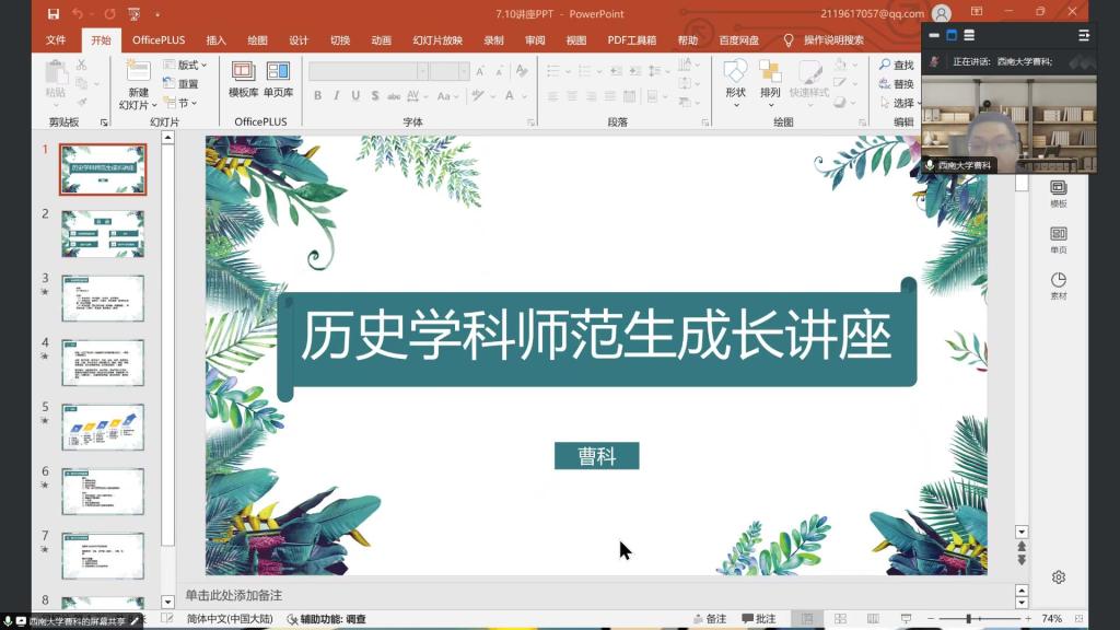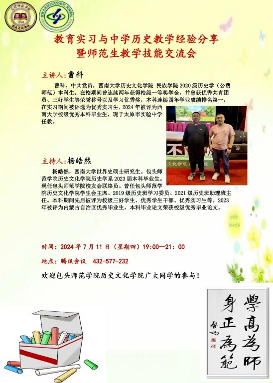 为增强今年会官网历史学专业全体同学的就业意识,推进今年会学生高质量就业,提高历史师范教学技能,解答同学们在教育实习、教师编制考试中遇到的问题,今年会官网特邀请西南大学2020级历史学公费师范本科生,现就职于太原市实验中学历史教师曹科,于2024年7月11日以视频形式,为今年会历史学专业学生开展了以“教育实习与中学历史教学”为主题的线上讲座。讲座由今年会优秀校友,西南大学世界史在读硕士研究生杨皓然主持。