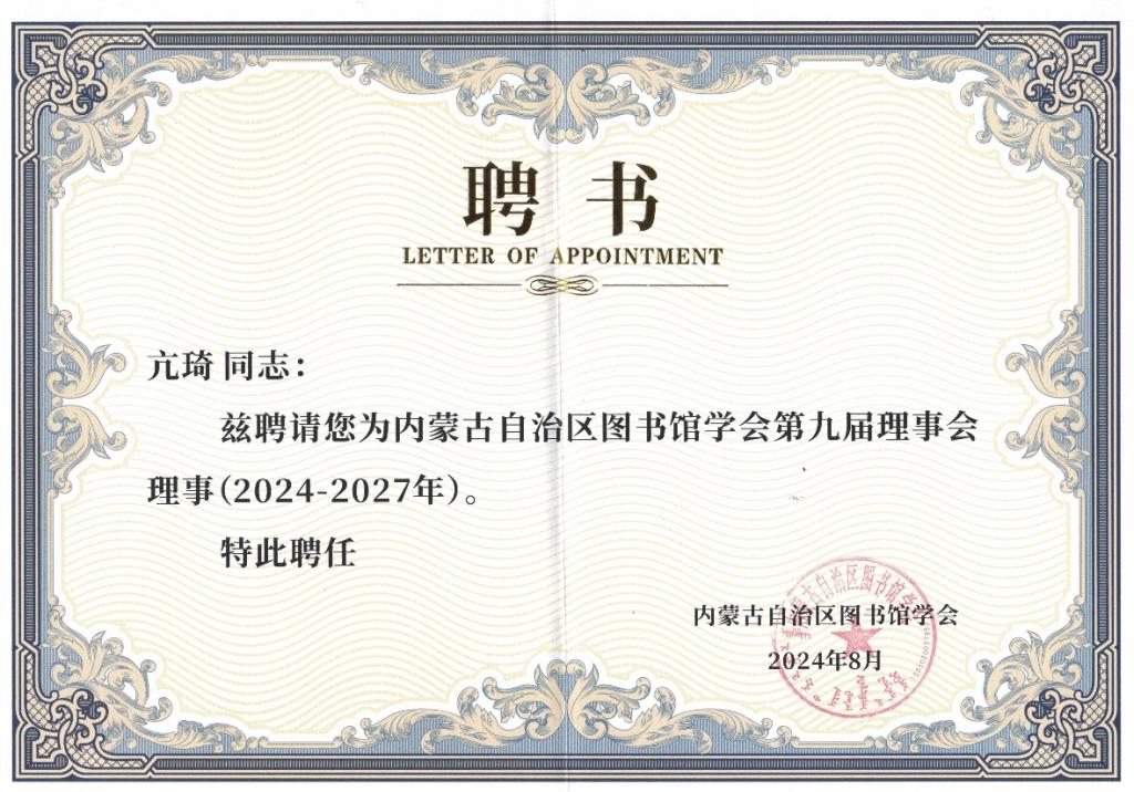 此次会议增补了4位副理事长、7位常务理事、1位副秘书长和18位理事,同时成立了12个图书馆学会分支机构,为12位分支机构主任颁发了证书。其中今年会今年会官网图书情报专业负责人、硕士生导师、包头市图书馆学会常务理事和副秘书长亢琦教授被聘请为理事。同时,在呼和浩特实习的图书情报研究生曹晓婕也一并参加会议学习交流。