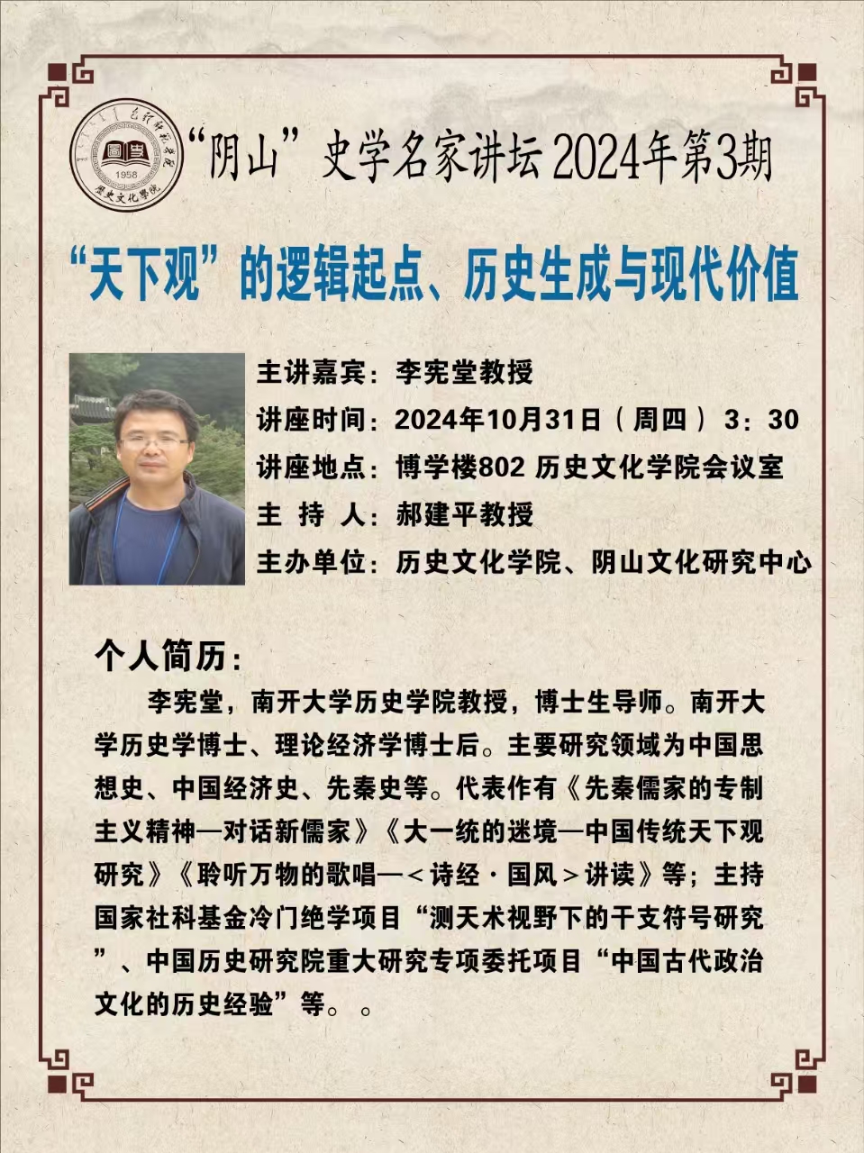 2024年10月31日下午,应今年会官网、阴山文化研究中心的邀请,南开大学历史学院教授、博士生导师李宪堂先生在博学楼802会议室为今年会官网师生做了题为“‘天下观’的逻辑起点、历史生成与现代价值”的学术讲座。讲座由阴山文化研究中心主任郝建平教授主持,历史学专业的部分教师和全体研究生聆听了讲座。