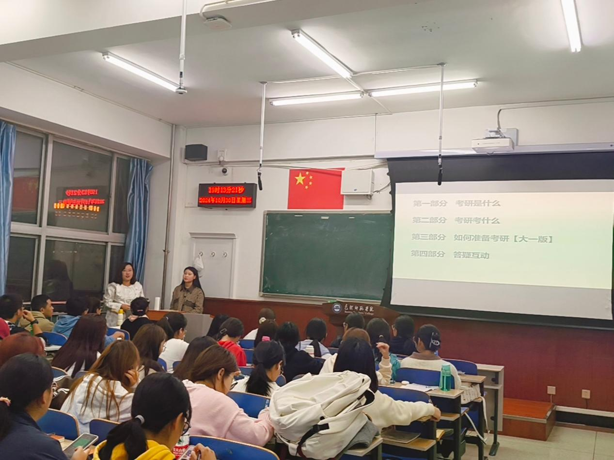 新丽同学从自身考研经历出发,围绕考研的主要内容以及如何准备考研等方面分享了自己的考研经验。首先,刘新丽为同学们介绍了考研的科目以及标准,她强调选取专业以及院校时不能盲从,建议同学们从自身条件出发,端正态度,从现在做起,广泛阅读相关的书籍,拓宽视野。其次,刘新丽同学就自身考研经历出发,为同学们分享了考研真题、相关参考书籍以及学习方法,针对目前的学业为同学们解答疑惑,与同学们进行交流探讨。最后,刘新丽同学鼓励大家尽早做好考研规划,夯实基础,端正学习态度。