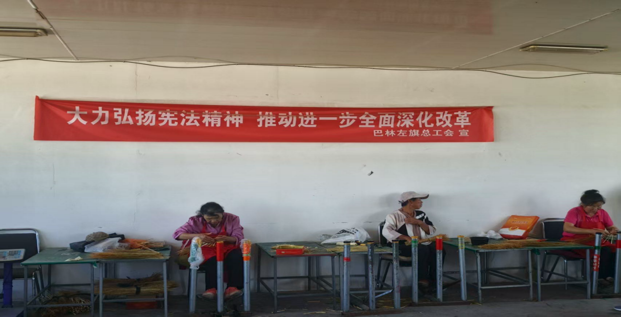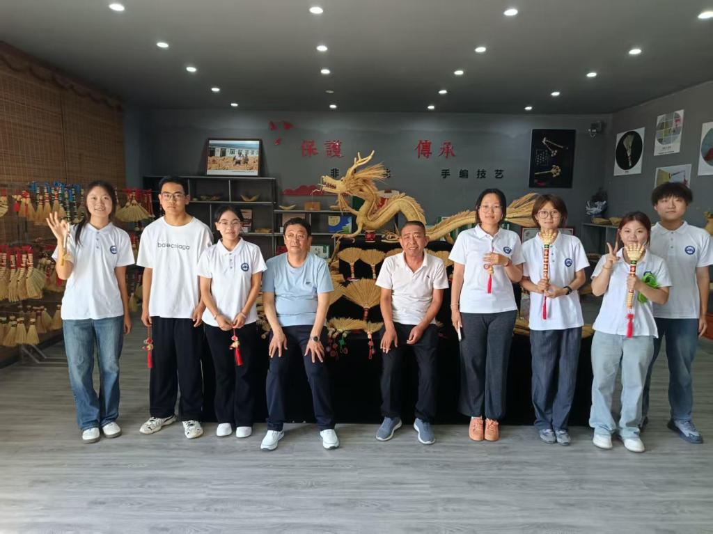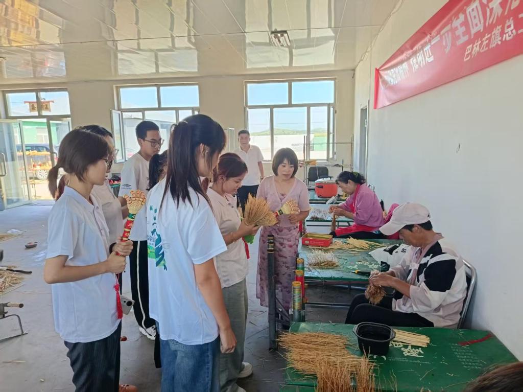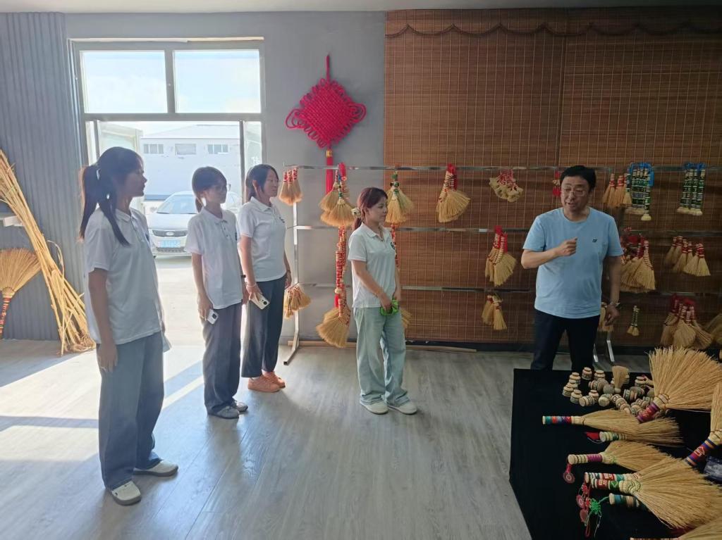 在“草原笤帚苗姑娘”非遗工坊,古老的草编技艺正焕发新生,为当地铺就一条创新驱动的致富新路。寻常的高粱秆在匠人的巧手编织下,蜕变成一把把精美的笤帚和一件件富有生命力的草编艺术品。在旗郑老师、崔老师的带领下,师生们参观了企业,非遗传承人窦亚男老师向团队介绍,这门传承百年的手艺,如今已发展成为惠及乡邻的“幸福产业”,工坊不仅有效吸纳周边村民就业,切实解决了许多人的生计难题,更积极探索“居家灵活就业”模式,为众多家庭搭建起创业平台。农闲时节,指尖编织的是艺术,更是实实在在的收入,手工制作已成为村民们增收致富的重要支撑。