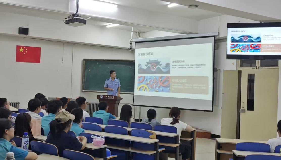 随后,讲座进入涉毒案例警示与新型毒品辨识环节。孙宝昌警官通过展示触目惊心的真实案例图片和视频资料,深刻揭露了毒品对个人身心健康、家庭幸福乃至社会稳定的巨大危害。他着重介绍了当前社会上出现的各种极具伪装性和迷惑性的新型毒品,如“笑气”、“跳跳糖”、“奶茶”、“邮票”等,详细讲解了其外观特点、滥用方式及致命危害,彻底撕下了新型毒品的“伪装衣”。孙警官严肃告诫同学们,一定要深刻认识毒品的极端危害性,坚决摒弃侥幸心理和好奇念头,树立正确的人生观、价值观,培养健康的生活情趣,坚决远离毒品,净化社交圈子,对一切涉毒行为保持零容忍态度。