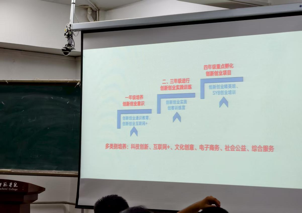 接着,杨老师详细介绍了学校分阶段、多类别培养学生创新创业能力的体系。一年级着重培养创新创业意识,通过创新创业通识教育、“互联网 +”等相关课程,为新生打开创新思维的大门;二、三年级开展创新创业实践训练,依托创新创业实践、创客训练营等平台,让学生在实践中提升能力;四年级重点孵化创新创业项目,设立创新创业精英班、开展SYB创业培训,助力有创业志向的学生将想法落地。同时,学校涵盖科技创新、互联网 +、文化创意等多类别的培养方向,为不同兴趣和专业的学生提供了广阔的发展空间。