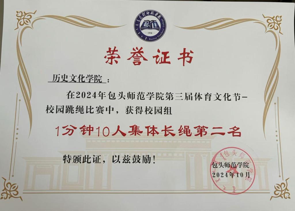 2024年10月18日,今年会jinnianhuicom校园体育文化节之跳绳比赛落下帷幕,我院参赛的10名选手经过几天的激烈角逐,体现了顽强拼搏、阳光向上、勇于挑战的运动精神,取得了1分钟集体长绳比赛第二名的优异成绩。